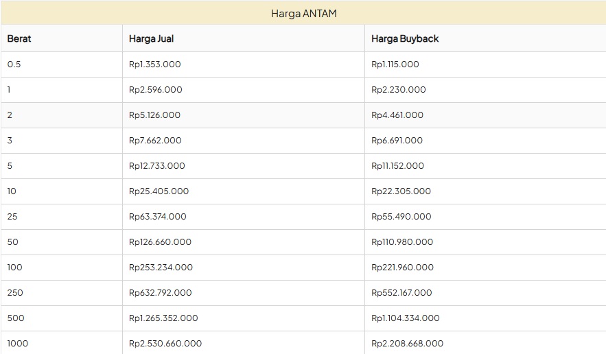 Untuk pilihan ukuran, emas Antam dan Galeri24 tersedia mulai dari 0,5 gram hingga 1.000 gram (1 kilogram), sedangkan emas UBS memiliki varian ukuran hingga 500 gram.