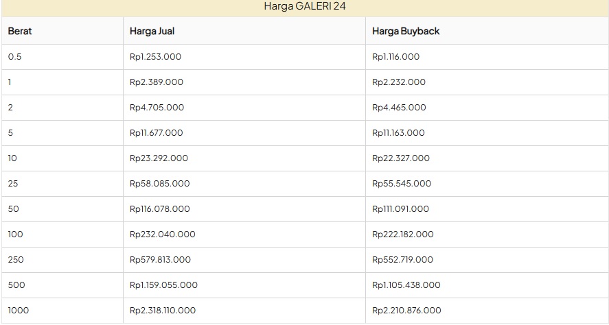 Kemudian harga emas Galeri 24 hari ini dibanderol Rp2.389.000 per gram naik Rp 54.000 dari harga sebelumnya Rp 2.335.000 per gram