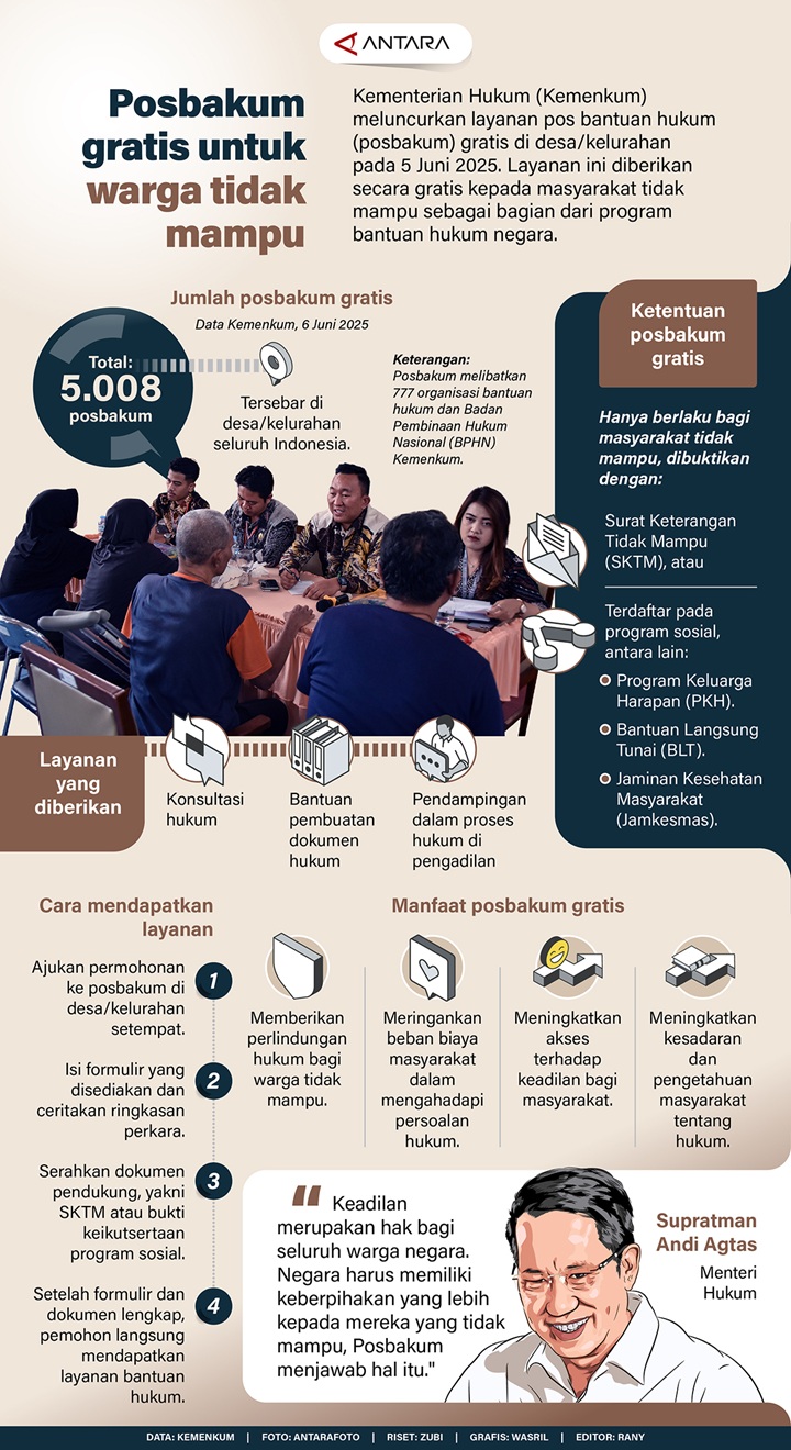 Kementerian Hukum (Kemenkum) meluncurkan layanan pos bantuan hukum (posbakum) gratis di desa/kelurahan pada 5 Juni 2025. Layanan ini diberikan secara gratis kepada masyarakat tidak mampu sebagai bagian dari program bantuan hukum negara. ANTARA