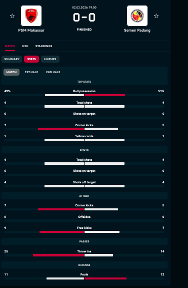 Harianjogja.com, JOGJA—PSM Makassar harus puas berbagi poin seusai dipaksa bermain imbang 0-0 oleh tamunya, Semen Padang, dalam lanjutan Super League 2025/2026. Bertanding di Stadion Gelora BJ Habibie pada Senin (2/2/2026), skuat Juku Eja sebenarnya tampil sangat dominan dan menggempur pertahanan lawan sepanjang pertandingan. Namun, buruknya penyelesaian akhir membuat rentetan peluang emas yang tercipta gagal dikonversi menjadi gol kemenangan di hadapan pendukung sendiri.
